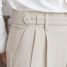 Diese Hose zeigt eine glatte, einheitliche Oberfläche mit deutlich sichtbaren Bundfalten auf der Vorderseite. Der Bund verfügt über Gürtelschlaufen sowie einen seitlich platzierten, sichtbaren Knopfverschluss. Die Hosenbeine verlaufen gerade und enden in einem leicht verkürzten Abschluss. Seitliche Eingrifftaschen sind klar erkennbar.