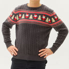 Questo maglione presenta un motivo a maglia combinato con motivi strutturali verticali e un'area decorativa nella parte superiore. Sono visibili motivi grafici ripetuti come figure e simboli di alberi disposti in una fila circolare. Il maglione ha una scollatura rotonda e maniche lunghe. I polsini delle maniche e l'orlo sono a coste e chiaramente definiti.