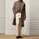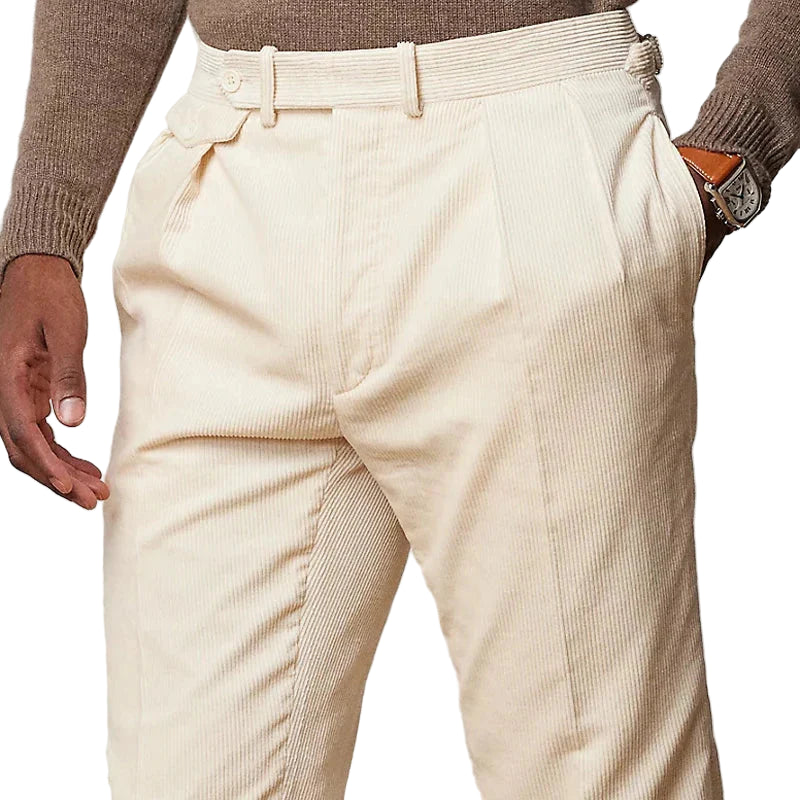 Diese Hose zeigt eine fein strukturierte Oberfläche mit sichtbarem Längsrippenmuster. Auf der Vorderseite befinden sich deutlich erkennbare Bundfalten. Der Bund verfügt über Gürtelschlaufen sowie einen seitlich platzierten Knopfverschluss. Die Hosenbeine verlaufen gerade und enden in einem leicht umgeschlagenen Abschluss.