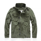 Die Jacke zeigt eine durchgehende Knopfleiste auf der Vorderseite. Auf der Brust befinden sich zwei aufgesetzte Taschen mit Klappen. Im unteren Bereich sind zwei seitlich platzierte Taschen sichtbar. Der Kragen ist hoch geschnitten und leicht nach oben gestellt.